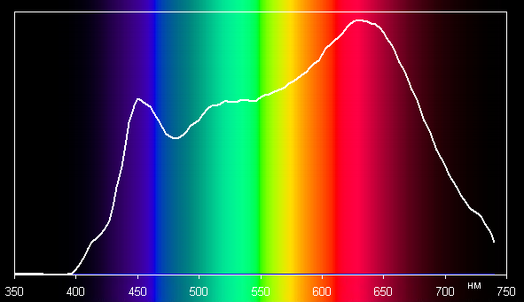 Значения цветовой температуры, ΔE и Ra, а также спектры ниже приведены для максимальной яркости, впрочем, отличия от характеристик для минимальной яркости несущественные.