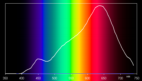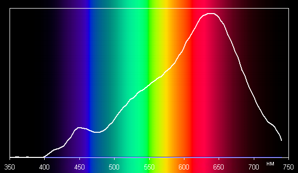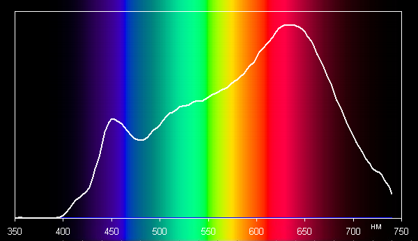 Корректно сравнивать спектр «обычной» лампы и спектр лампы Remilicht LA-H688 для режима Ночь, в котором цветовая температура (2600 К) близка к таковой для «обычной» лампы (2520 К). Видно, что пик в синей области у LA-H688 шире и вообще выражен слабо. Отметим, что только в режиме Ночь светится один тип светодиодов, в других трех режимах одновременно светятся оба типа светодиодов.