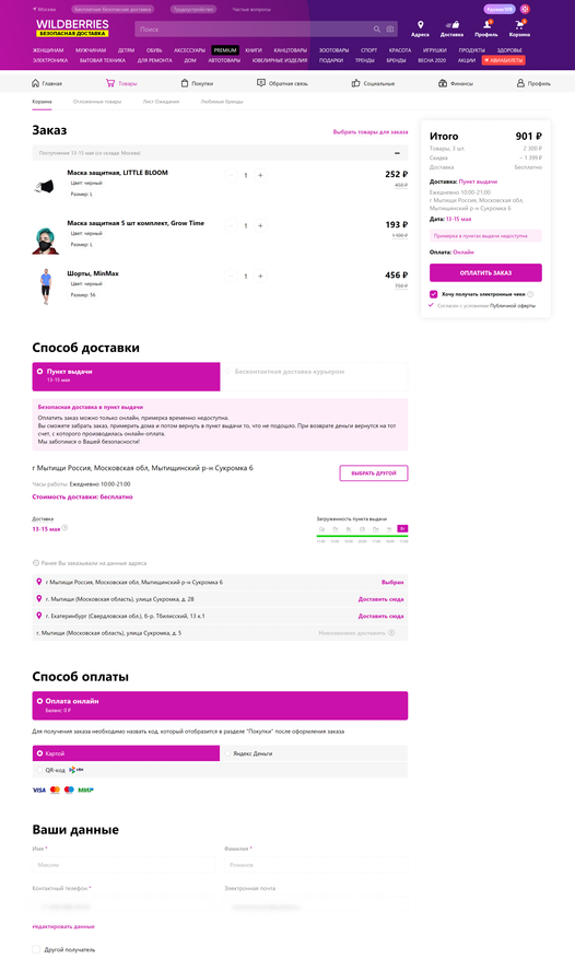Собираем необходимые покупки, выбираем пункт выдачи — видим, что доставка в него возможна уже на следующий день. Оплату Wildberries пока принимает только онлайн, чтобы сократить время нахождения покупателя в пункте самовывоза и его контакт с менеджером, что в целом довольно логично. В корзине присутствует еще одно предупреждение о том, что примерка пока невозможна, зато можно вернуть не подошедшие товары. В нижней части страницы расположена форма контактных данных, у авторизованных пользователей после первого заказа она заполняется автоматически.