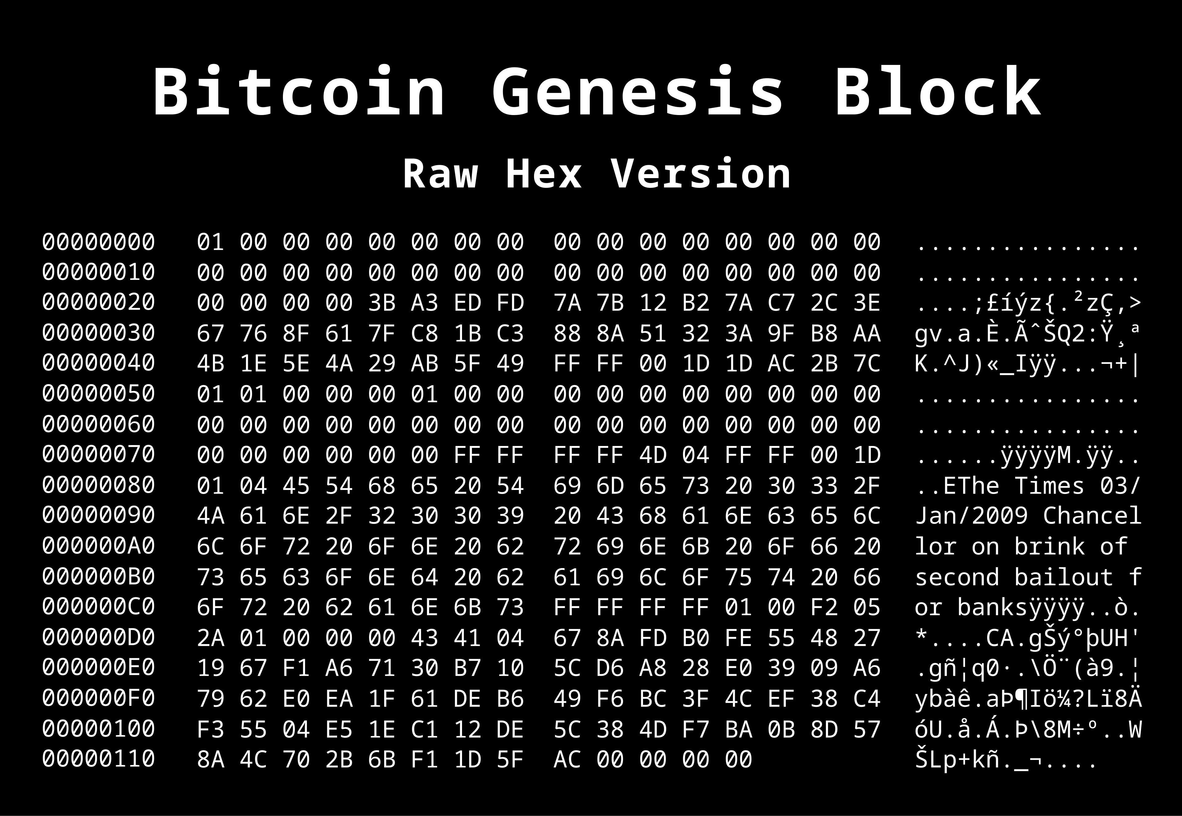 3 января 2009 года был добыт Genesis блок. В него было вшито сообщение — заголовок британской газеты The Times: «Chancellor on brink of second bailout for banks». Это одновременно и временная метка, и политическое заявление. Выбор британской газеты наталкивает на мысль о связях создателя с Великобританией или о намеренном создании такого исторического маркера.