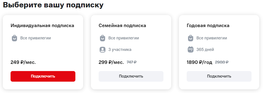 По нынешним тарифам подписка обходится в 100-150 рублей в месяц. Почему столько, если официально написано про 249 рублей? А не надо индивидуальную на месяц оформлять. Фиксировать стоит либо годовую плату в 1890 рублей в месяц на одного, либо 299 рублей в месяц на троих. Последнее официально зовется «МТС Premium для семьи», но свидетельство о браке или какие-либо еще документы не требуют. Вообще же именно эта опция оправдывает себя и при паре пользователей, а если на троих сообразить — так и вовсе становится самой дешевой. Но это, повторюсь, если сейчас подключать — завтра может быть хуже.