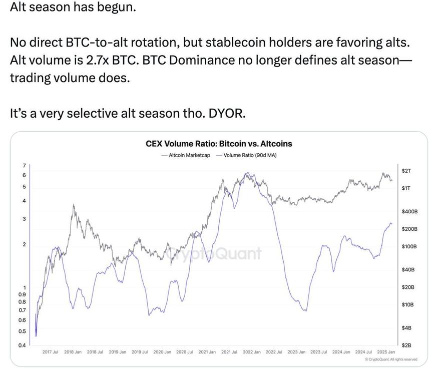 По данным аналитической компании CryptoQuant, торговая активность альткоинов на централизованных биржах (CEX) в настоящее время в 2,7 раза превышает объемы биткоина. Этот показатель, а не доля биткоина на рынке, теперь определяет начало альтсизона. Эксперты отмечают, что рост интереса к альткоинам связан с перераспределением капитала держателей стейблкоинов, которые ранее предпочитали более стабильные активы.