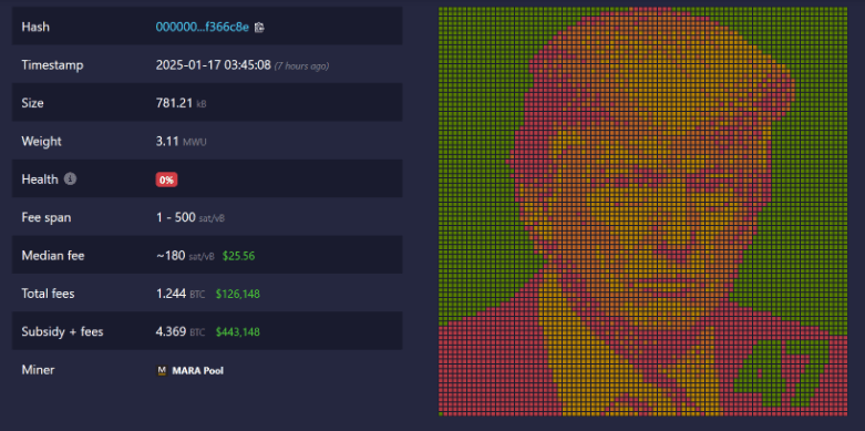 Крупная майнинговая компания MARA Holdings совершила необычную транзакцию в сети биткоина, разместив в блоке 825 642 портрет Дональда Трампа, созданный с помощью искусственного интеллекта. Символическая транзакция, получившая название «Трамп 47», обошлась компании в 1,244 BTC (около $127 000) и была призвана продемонстрировать поддержку избранного президента США.