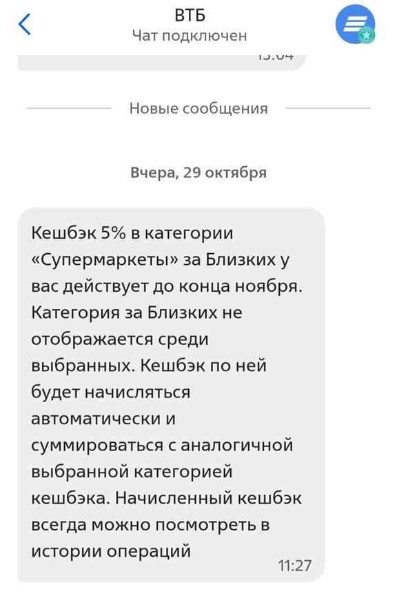 Но главное, безусловно, кэшбек в супермаркетах — тем более, что его и дают абсолютно бесплатно. Хотя и немножко не договаривают, что в обязательном порядке 5% будут лишь до 31.12.2024 года, а дальше — уж как получится, но это общая практика. Пресловутая обязательность хотя бы одной категорий с кэшбеком 25% тоже фактически лишь шесть месяцев продержалась — в октябре ещё предлагали, а на ноябрь (судя не только по личной практике, но и по отзывам) 15% максимум. Так что всё течёт, всё меняется понятно в какую сторону. Однако обязательность этой категории в списке повышенных прописана как минимум до конца акции «Мои близкие» (то есть до конца следующего года), а она и сама по себе ценна — учитывая, что у ВТБ и кэшбек «за всё» не обязателен (и я лично без него в ноябре как раз умудрился остаться).