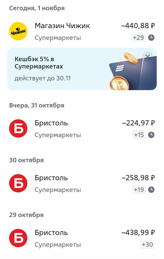 Дальше будет переход на «типовые» условия — то есть никаких сложений, но на 5% в декабре в обязательном порядке можно рассчитывать. Граничная дата, похоже 9 число каждого месяца (когда обычно начисляется кэшбек за предыдущий): подключившиеся к акции «Мои близкие» до 9 октября на ноябрь супермаркеты уже выбирают как одну из категорий повышенного кэшбека. Если эта гипотеза верна, то новым потенциальным пользователям есть смысл подождать до 9 ноября — чтобы захватить и весь декабрь на таких условиях. Впрочем, и ждать-то всего неделю осталось.