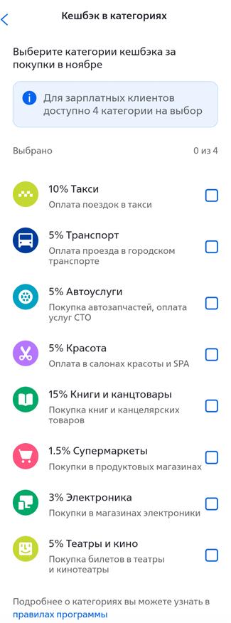Скриншот выше иллюстрирует второе — у меня и так были выбраны 2% в супермаркетах, так что в октябре начислялось 7%, а в ноябре стало 6,5%.
