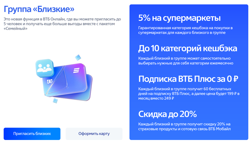 Что же касается той, о которой пойдёт речь сегодня, она по-своему новая. Логика — привычная: скидки и бонусы присоединившимся клиентам. Но, если до последнего времени банки в основном гонялись за каждым по-отдельности, то «Мои близкие» от ВТБ ориентирована уже на целые семьи или просто друзей и знакомых: в одиночку принять участие не получится. Тоже в какой-то степени веяние времени — недаром большинство разнообразных подписок на цифровые услуги стали групповыми. Сначала к созданию групп клиентов подталкивали только тарифами, сейчас же индивидуальных версий «Яндекс Плюс» или «МТС Premium» просто не осталось — только на четверых. Не обязательно родственников — никто этого не проверяет. И ВТБ — тоже.