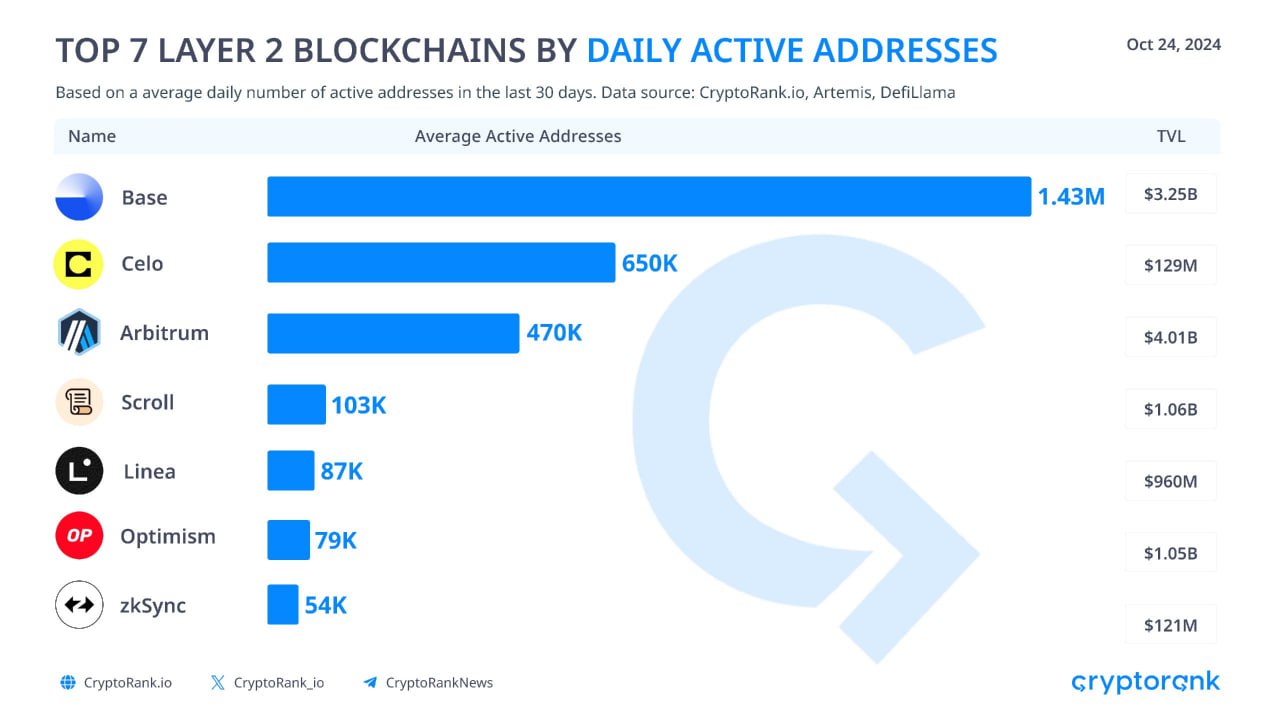 Согласно последнему отчету аналитической платформы CryptoRank, блокчейн Base укрепил свои позиции как ведущая сеть второго уровня (L2), продемонстрировав впечатляющий показатель в 1,43 миллиона активных адресов за последний месяц. Эти данные подтверждают растущую популярность L2-решений среди пользователей криптовалютных сервисов и децентрализованных приложений.