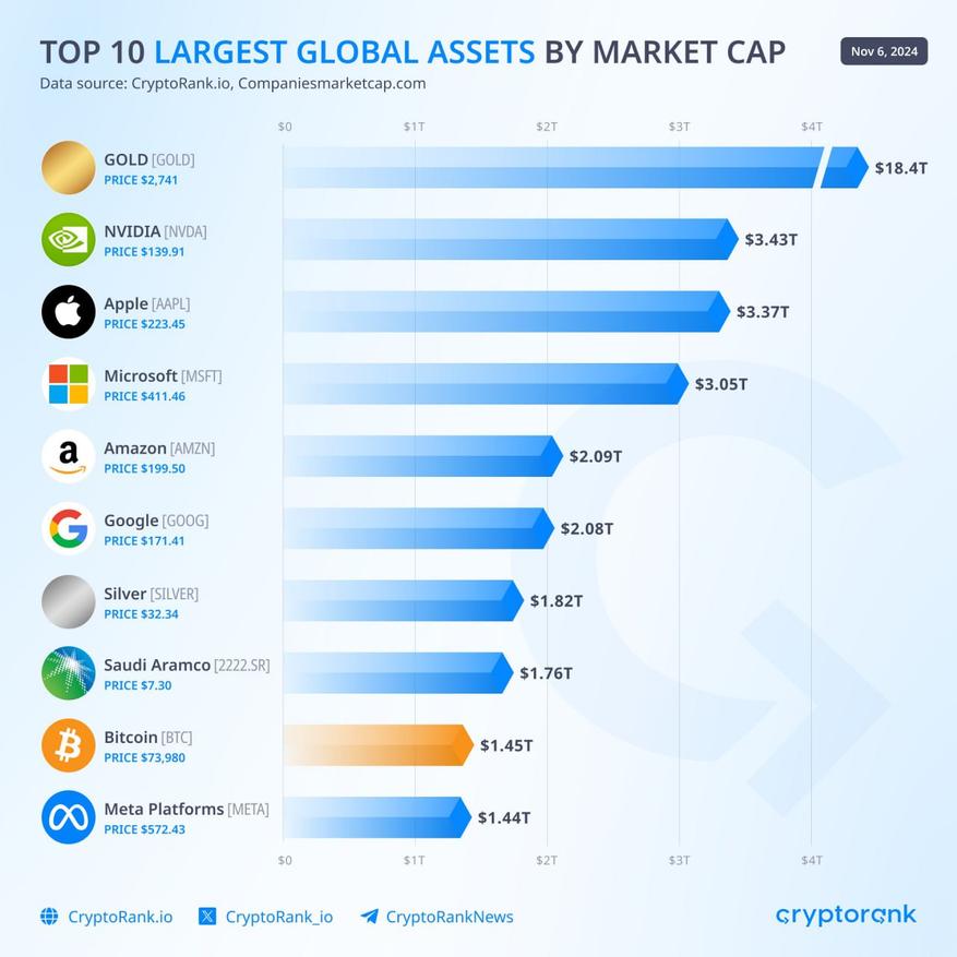 Новый рейтинг крупнейших активов по капитализации, составленный командой CryptoRank, свидетельствует о впечатляющем росте позиций биткоина. Первое место в топе занимает золото с показателем около $18,4 трлн.