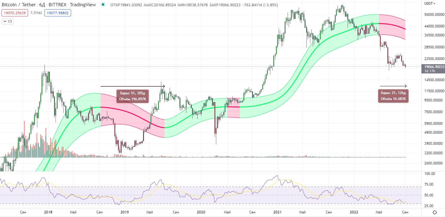 Гауссов канал сигналит о перепроданности, мы уже давно в красной зоне, под каналом. Но обратите внимание, в прошлой медвежке мы находились в этой зоне 305 дней, а в текущей ситуации - всего 126. И это, не учитывая фундаментальные показатели, но о них речь в статье ниже.