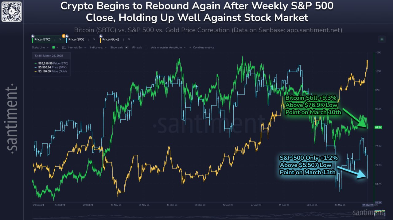 Исторически биткоин быстро реагировал на ухудшение рыночной обстановки, как это было во второй половине 2022 года, когда криптовалюта падала вместе с традиционными рынками. Однако в последние годы, по данным Santiment, BTC стал более независимым от таких движений. В марте 2025 года, несмотря на спад S&P 500, биткоин показал восстановление, что подтверждает его растущую автономность.