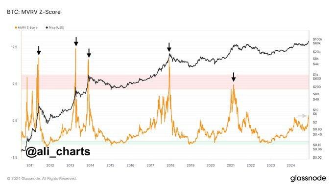 Анализ индикатора MVRV Z-Score, отслеживающего относительную оценку биткоина, свидетельствует, что текущий курс BTC все еще далек от своего исторического пика. На графике видно, что индикатор значительно отстает от зон перегрева, которые в прошлом сигнализировали о вершинах рыночных циклов. Это говорит о потенциальном пространстве для дальнейшего роста.
