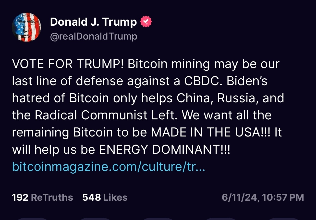 В своем последнем громком заявлении бывший президент США Дональд Трамп выступил с призывом обеспечить, чтобы весь оставшийся биткоин был добыт в пределах Соединенных Штатов.