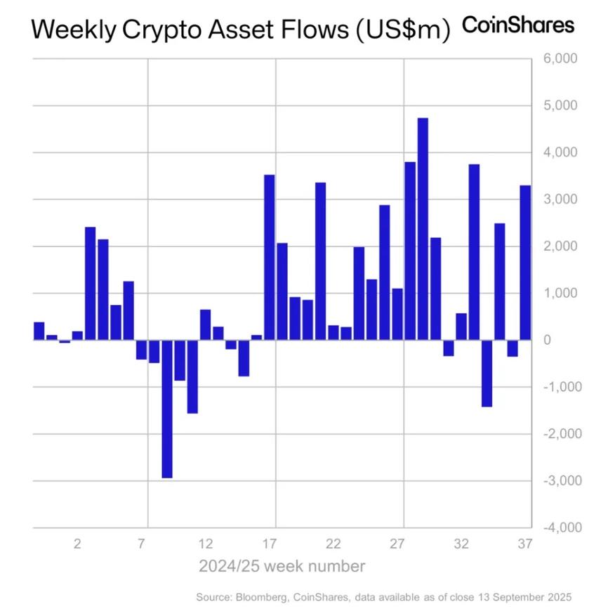Инвестиционные продукты на основе цифровых активов зафиксировали значительный приток капитала в размере 3,3 миллиарда долларов США за период с 5 по 13 сентября 2025 года, согласно последнему отчету аналитической компании CoinShares. Этот показатель отражает растущее доверие инвесторов к криптовалютному рынку в текущем квартале.