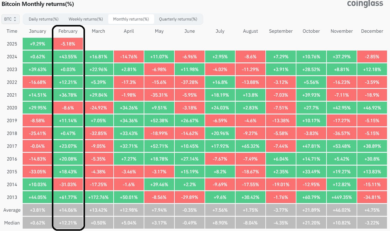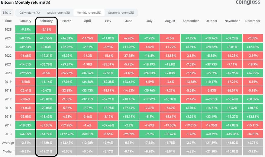 Анализ исторических данных показывает, что февраль традиционно является одним из самых благоприятных месяцев для Bitcoin. За последние 13 лет только три раза в этом месяце была зафиксирована отрицательная доходность: в 2014 году (-31,03%), в 2020 году (-8,6%) и в текущем 2025 году, где пока наблюдается снижение на 5,18%. Средняя доходность февраля составляет +14,06%, а медианная +12,21%, что подтверждает устойчивую тенденцию к росту в этом месяце.