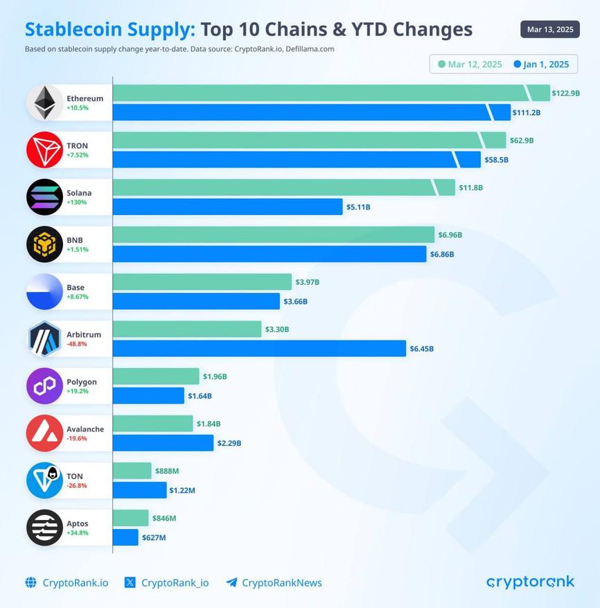На фоне этого Ethereum сохраняет лидерство по общему объему стейблкоинов с показателем 122,9 миллиарда долларов, что на 10,5% больше, чем в начале года, когда сумма составляла 111,2 миллиарда долларов. Tron занимает вторую позицию с 62,9 миллиарда долларов и ростом на 7,52%. Другие сети, такие как BNB Chain и Base, показали более скромные результаты — 6,96 миллиарда долларов (+1,51%) и 3,97 миллиарда долларов (+8,67%). Однако не все платформы могут похвастаться успехом: Arbitrum и TON столкнулись с падением на 48,8% и 26,8%, до 3,3 миллиарда долларов и 888 миллионов долларов соответственно.