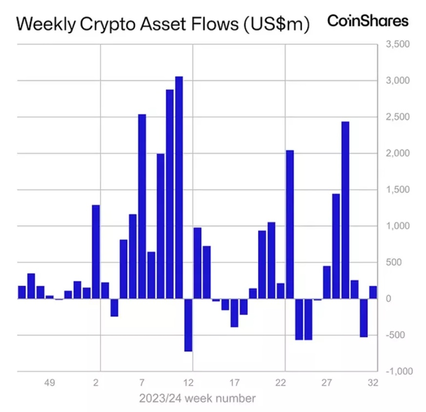 Согласно последнему отчету аналитической компании CoinShares, криптовалютный рынок показывает признаки оживления. За период с 3 по 9 августа криптовалютные инвестиционные фонды зафиксировали приток средств в размере 176 миллионов долларов США, что резко контрастирует с предыдущей неделей, когда наблюдался отток в 528 миллионов долларов.