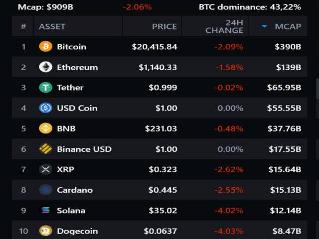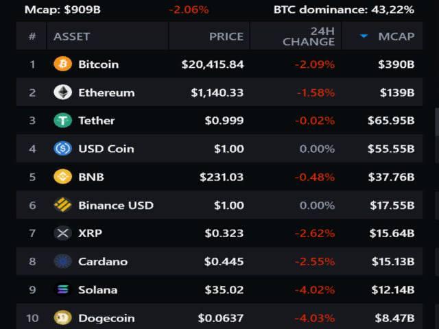 Биткоин упал до 20 415 долларов, хотя сегодня он вырастал до 21 142 доллара. Эфир просел на 1,58% до 1140 долларов, а BNB подешевела на 0,48% до 231,03 доллара.