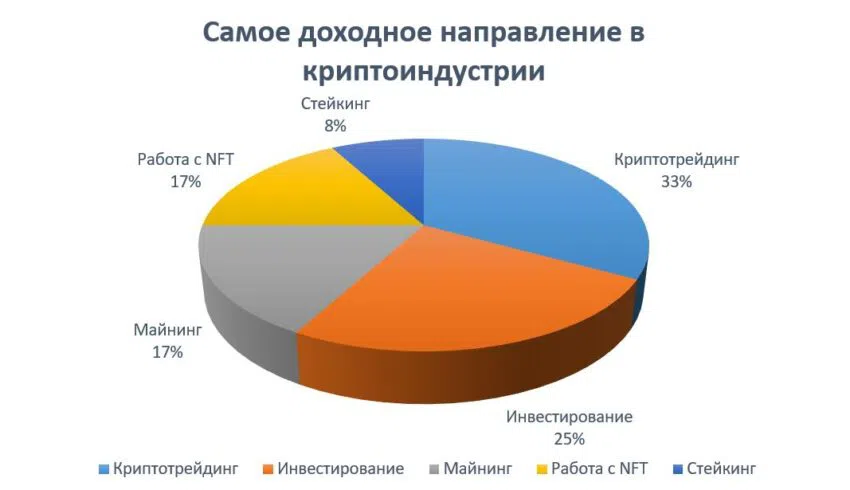 На первом месте, по мнению участников, оказался криптотрейдинг. За него проголосовали 33% участников. Однако, стоит отметить, что это направление одно из самых рисковых и трудных. Поскольку лишь малая часть трейдеров на рынке могут по-настоящему зарабатывать на движении рынка. Подавляющее большинство трейдеров быстро теряют свои депозиты. Поэтому, если вы и собираетесь зарабатывать на таком рынке, то рекомендуется пройти обучение. Залезая в него без каких-либо знаний, вы просто потеряете свой депозит.