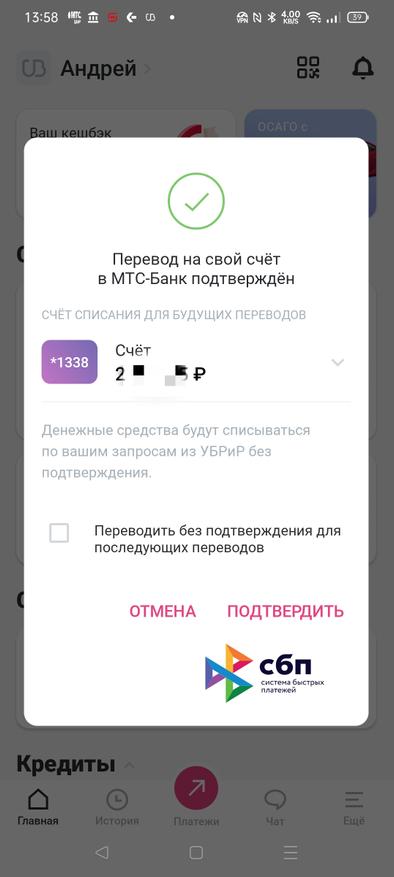 …но по-умолчанию нуждается в подтверждении. Делается это в приложении того банка, из которого деньги вытягиваются, причем для всех последующих переводов подтверждение можно и отключить уже. Хотя можно последнее сделать заранее — просто создав привязку для подобных операций.