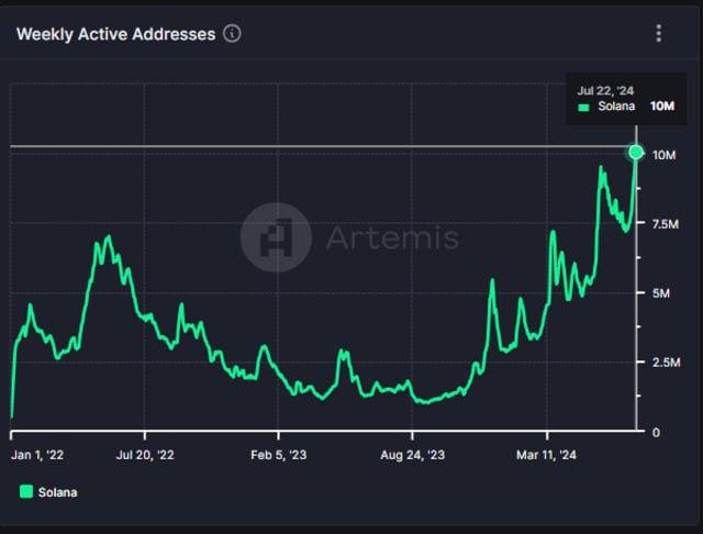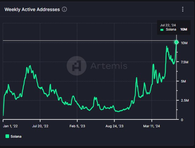 В июле сеть Solana продемонстрировала беспрецедентный уровень адресной активности, установив новый исторический рекорд. Согласно данным аналитической платформы Artemis, за последнюю неделю количество уникальных адресов, ежедневно участвующих в транзакциях на блокчейне Solana, превысило отметку в 10 миллионов. Этот показатель свидетельствует о значительном росте интереса к экосистеме Solana как со стороны инвесторов, так и разработчиков децентрализованных приложений.
