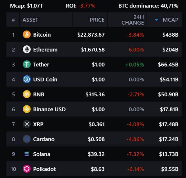 Биткоин, который вчера торговался в районе 24 000 долларов, за ночь отступил 22 873 доллара, а капитализация BTC сократилась до 438 млрд долларов.