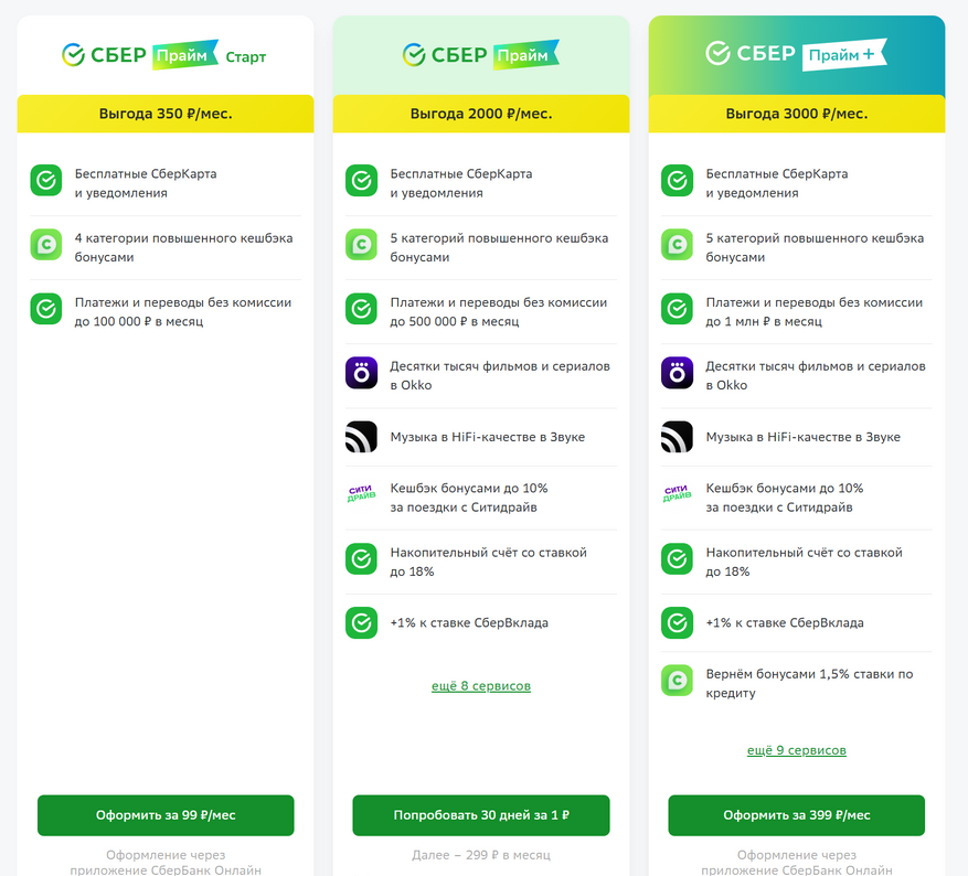 Но это «лёгкая» версия — две основные посложнее. При их появлении предполагалось, что СберПрайм будет чисто экосистемной, но не затрагивать «врожденные» сервисы Сбербанка, а вот старшая версия — это и есть СберПрайм Плюс услуги по банковским продуктам. Действительность же оказалась довольно суровой, так что в процессе тюнинга (в первую очередь — базовой) эти подписки оказались практически одинаковы. Отличий — ровно три: в плюснутой версии платежи и переводы без комиссий до миллиона рублей в месяц, а не до 500 тысяч, снятие наличных до 500 тысяч рублей в день и до 5 миллионов в месяц, ну и кэшбек с кредита — 1,5% с начисленных процентов. Прямо скажу — не впечатляет. Лишние 2% по накопительному счёту и 1% по вкладу — интересно, пять категорий кэшбека — тоже, но это всё есть и в обычном СберПрайм.