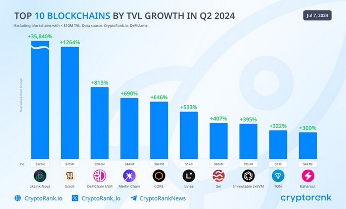 Лидерами рейтинга стали zkLink Nova и Scroll, продемонстрировав поистине космический рост TVL на 35 840% и 1 264% соответственно. Эти сети достигли показателей в $523 млн и $765 млн заблокированных активов. Третье место досталось блокчейну DeFiChain EVM с приростом в 813%, что позволило ему достичь отметки в $28,6 млн TVL.