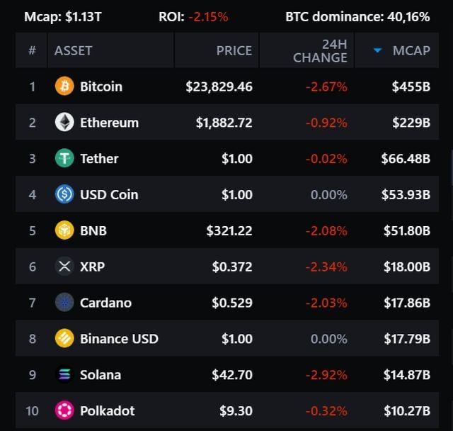 В итоге главная криптовалюты просела до 23 835, а капитализация биткоина составляет 455 млрд долларов. Эфир подешевел до 1882 долларов, а BNB торговалась за 321,22 доллара.