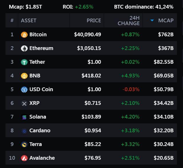 Капитализация крипторынка составляет $1,85 трлн, что на 2,65% больше, чем накануне, а индекс доминирования биткоина равен 41,24%.