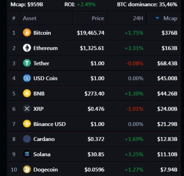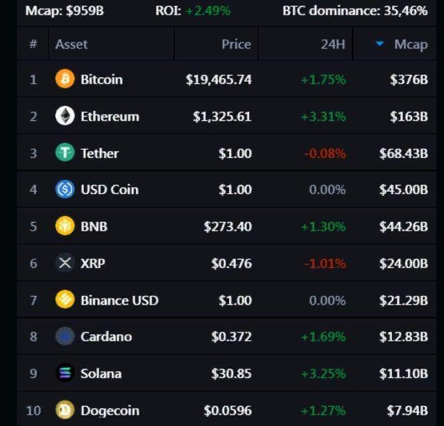 Капитализация крипторынка — $959 млрд (+2,49%), индекс доминирования биткоина — 35,46%.