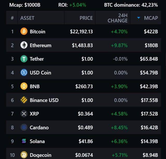 Главная криптовалюты выросла на 4,7% до 22 192 долларов, при этом капитализация биткоина составила 422 млрд долларов. Индекс доминирования биткоина равен 42,23%.
