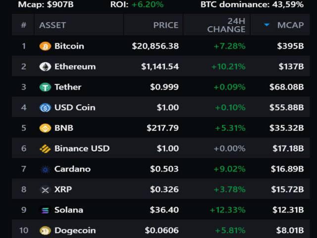 К вечеру главная криптовалюта мира подорожала на 7,28% до 20 856 долларов, при этом капитализация BTC достигла 395 млрд долларов. Эфир прибавил более 10% и подорожал до 1141 доллара. Напомним, на выходных курс временно падал ниже 900 долларов.