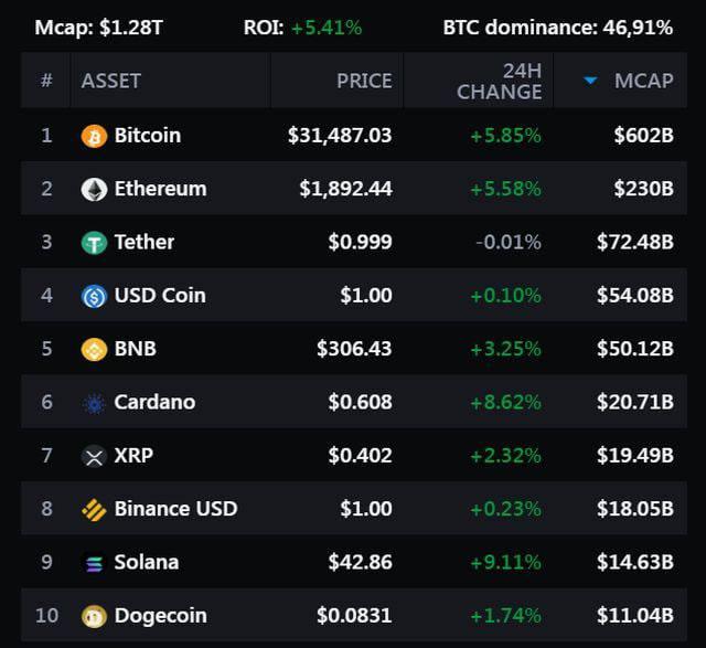 Капитализация крипторынка выросли на 5,41% до 1,28 трлн долларов.