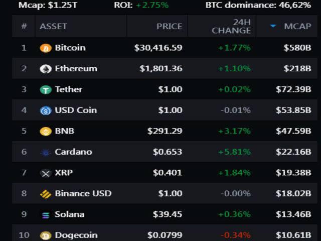 Сегодня вечером по состоянию на 18:00 по московскому времени главная криптовалюта мира укрепилась на 1,77% до 30 416 долларов. Капитализация биткоина составляет 580 млрд долларов, при этом индекс доминирования биткоина равен 46,62%.