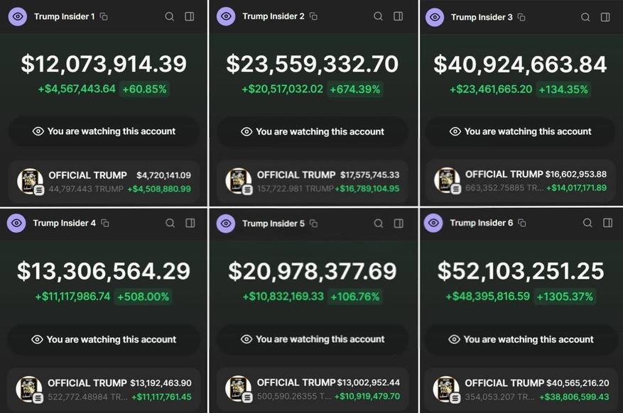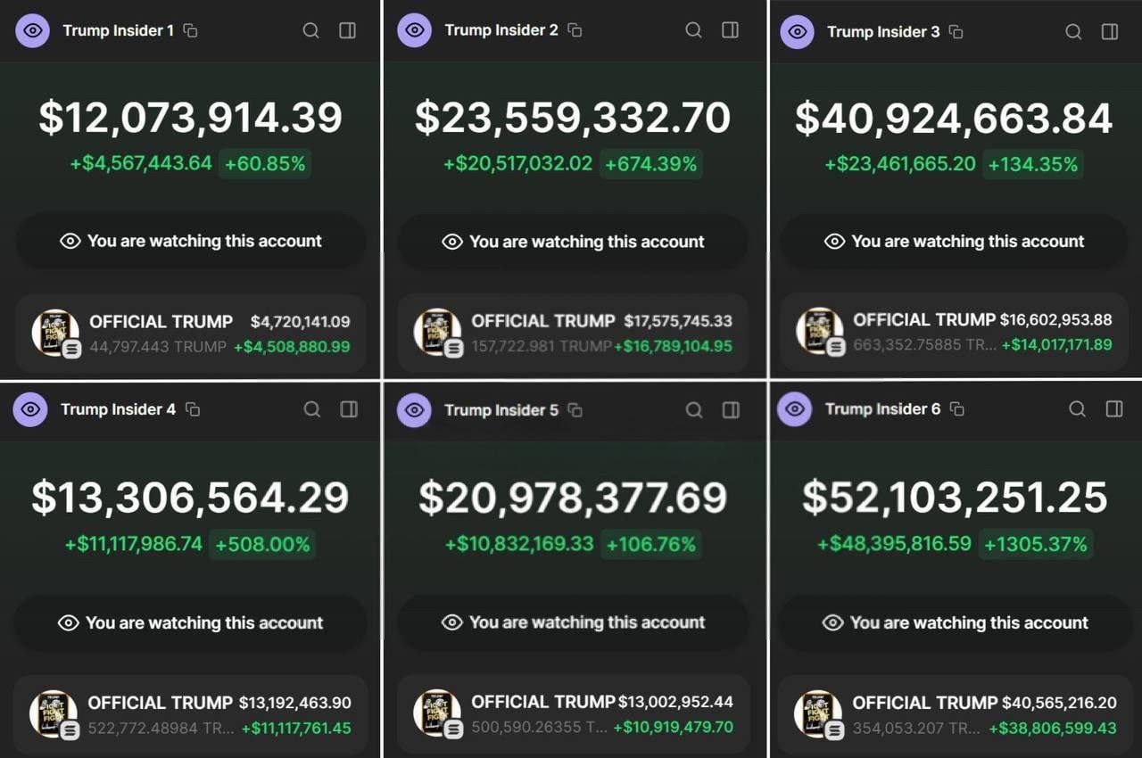 Представленные данные демонстрируют серию подозрительных торговых операций с мемкоином TRUMP, совершенных шестью кошельками в момент листинга токена. Согласно скриншотам торговых аккаунтов, прибыль трейдеров варьируется от 60% до впечатляющих 1305%, что может указывать на наличие предварительной информации о запуске.