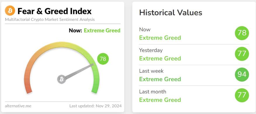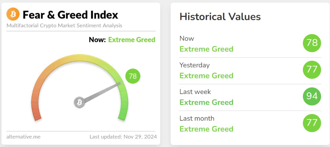 Несмотря на небольшую коррекцию до 95 907 долларов после кратковременного подъема в азиатскую сессию, настроения на криптовалютном рынке остаются крайне оптимистичными. Это подтверждается устойчиво высокими показателями индекса «крипто-страха и жадности», который продолжает находиться в зоне экстремальной жадности, даже при относительно низкой торговой активности.