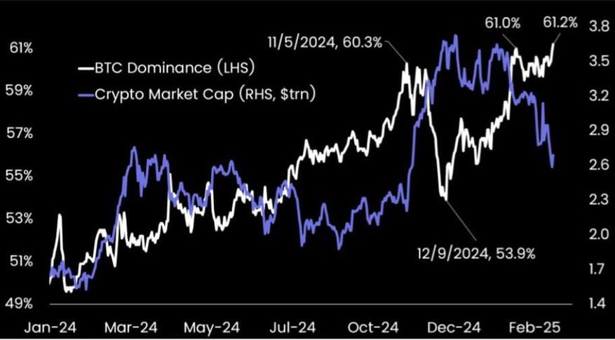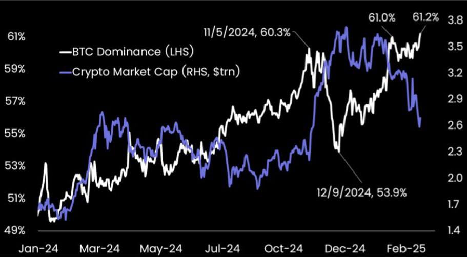 Индекс доминирования биткоина на рынке криптовалют вырос с 54% в декабре до 61,2% к середине марта, сообщают аналитики Matrixport. Это указывает на перераспределение капитала: трейдеры все чаще выбирают биткоин, в то время как альткоины теряют инвестиции. Такое смещение предпочтений отражает стремление участников рынка к большей стабильности в условиях неопределенности.
