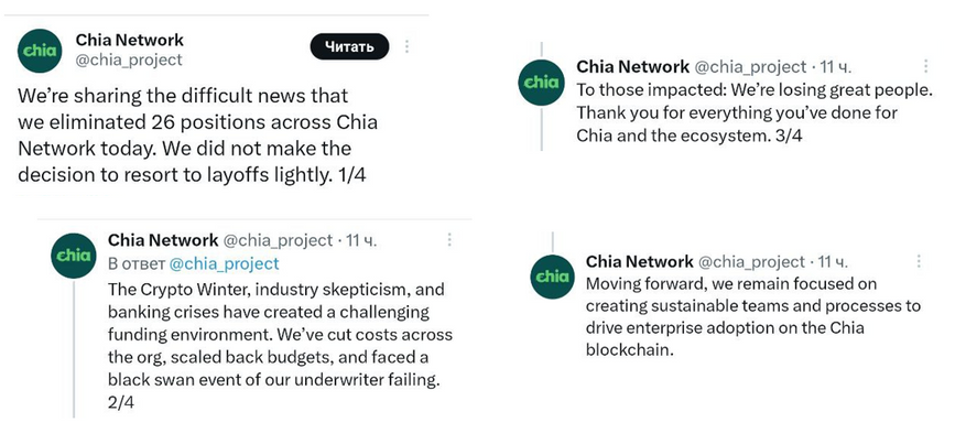Криптозима, скептицизм в индустрии и банковский кризис создали сложные условия для финансирования. Мы сократили расходы по всей организации, урезали бюджеты и столкнулись с «черным лебедем» — наш андеррайтер обанкротился. Тем, кого это коснулось: Мы теряем замечательных людей. Спасибо вам за все, что вы сделали для Chia и экосистемы. В дальнейшем мы по-прежнему будем заниматься созданием устойчивых команд и процессов, способствующих внедрению блокчейна Chia в корпоративном секторе.