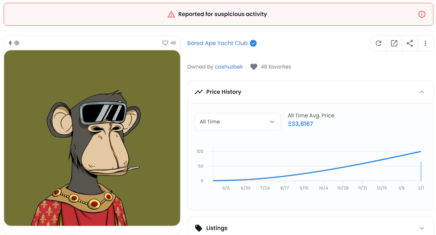 Как стало известно, пользователь потратил 140 эфиров или более 400 000 долларов на приобретение NFT-обезьяны из знаменитой коллекции Bored Ape Yacht Club (BAYC). Однако в итоге выяснилось, что невзаимозаменяемый токен оказался краденным, поэтому его заблокировали.