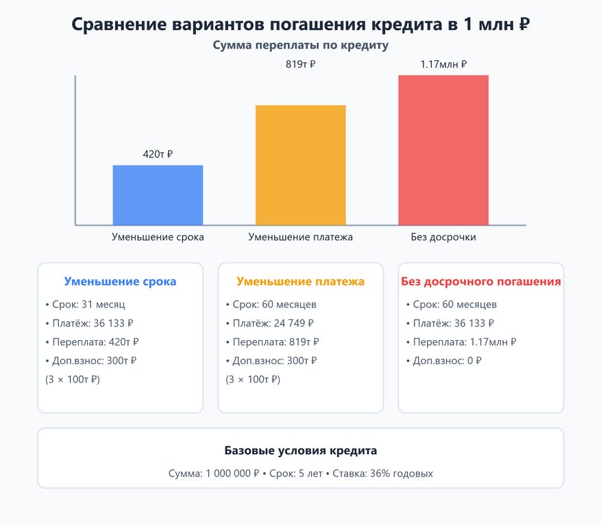 - Вариант 1 (уменьшение срока): При ежемесячном платеже 36 133 рубля и внесении дополнительных 100 000 рублей в первые три месяца срок кредита сократится до 31 месяца вместо изначальных 60. Общая переплата составит 420 122 рубля. Размер платежа останется прежним до полного погашения.