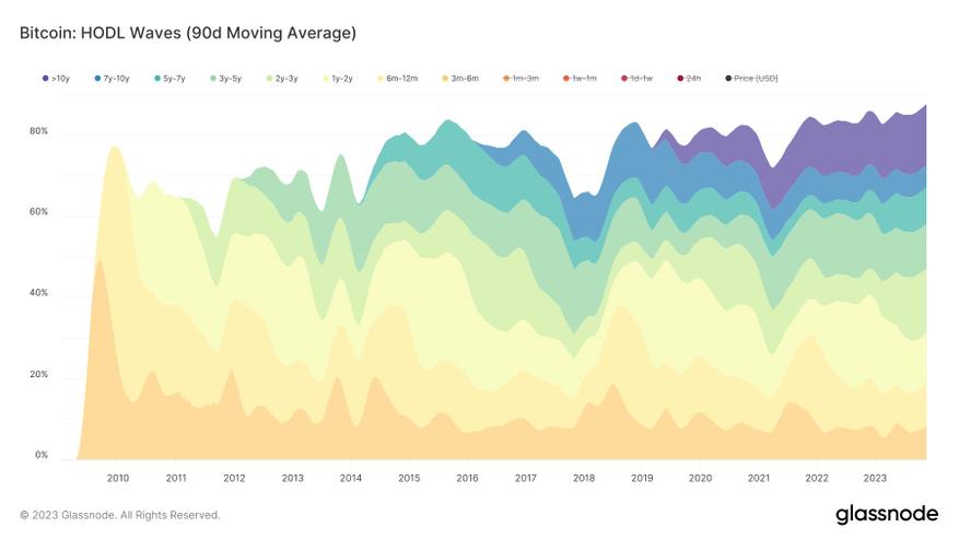 Ходлинг отражает твердую веру долгосрочных инвесторов во внутреннюю ценность этой инновационной криптовалюты. Диаграмма Glassnode, иллюстрирующая волну HODL биткоинов, отображает, как меняется поведение инвесторов со временем, а различные цвета обозначают периоды владения биткоинами. Преобладание более «холодных» оттенков подтверждает, что большая часть биткоинов не подвергалась торговле и продаже в течение продолжительного периода, что поддерживает идею о дефиците.
