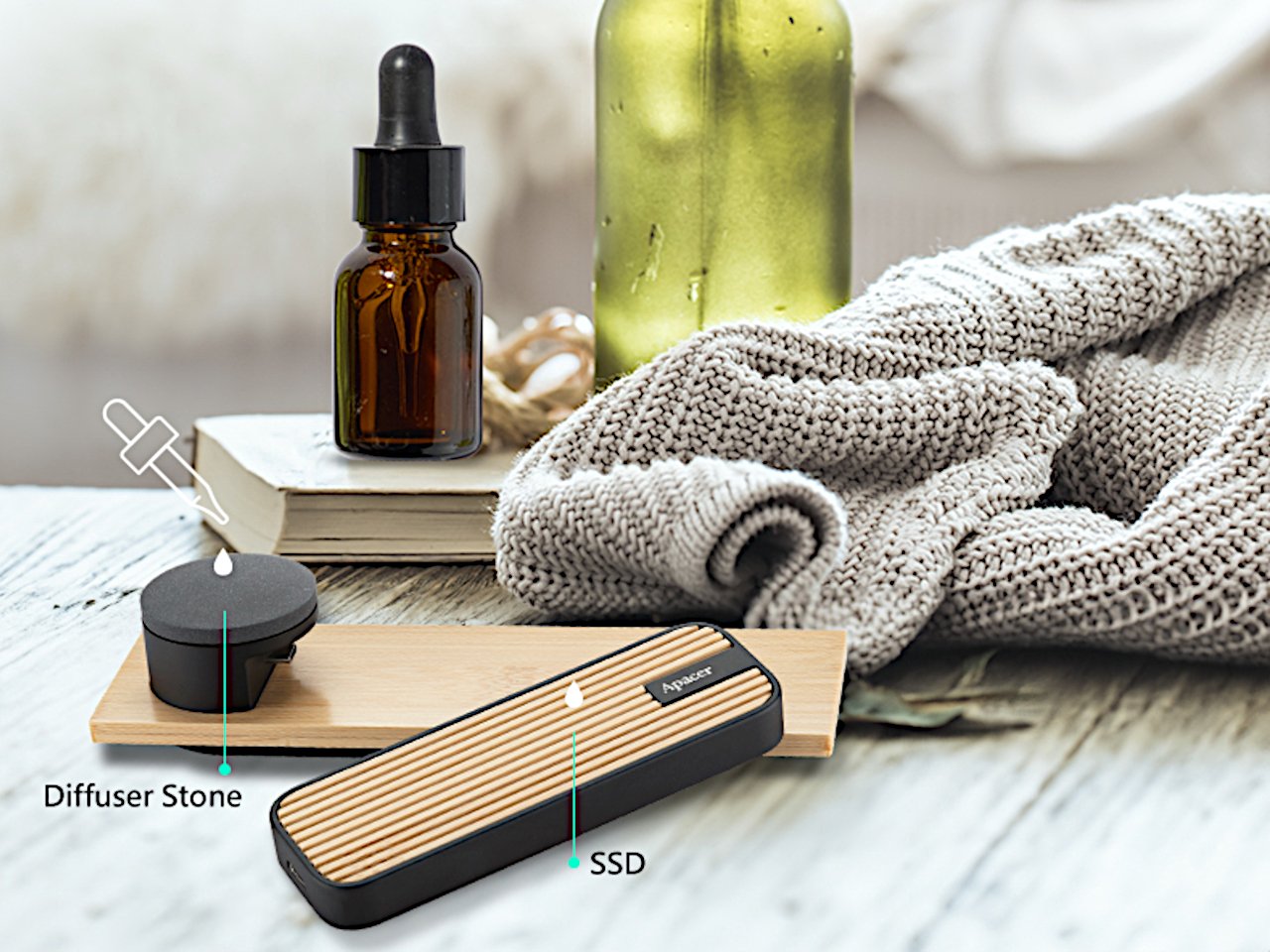 Компания Apacer представила портативный твердотельный накопитель AS712, совмещающий функции хранения данных и диффузора эфирных масел. Устройство выполнено из комбинации бамбука и алюминия. Бамбуковая верхняя панель является съемной и скрывает под собой специальное отделение для размещения ватного диска или фетровой подкладки, которые пропитываются эфирными маслами.