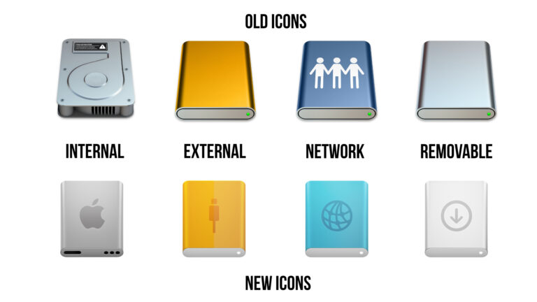 Обновление затронуло не только системный диск, но и все связанные иконки в операционной системе. Внешние накопители теперь представлены оранжевым значком с USB-C разъёмом, сетевые ресурсы получили синюю иконку с глобусом, а образы съёмных дисков стали белыми со стрелкой сверху.