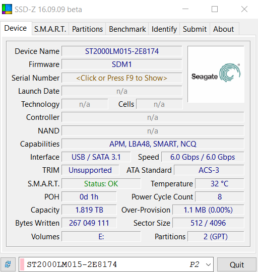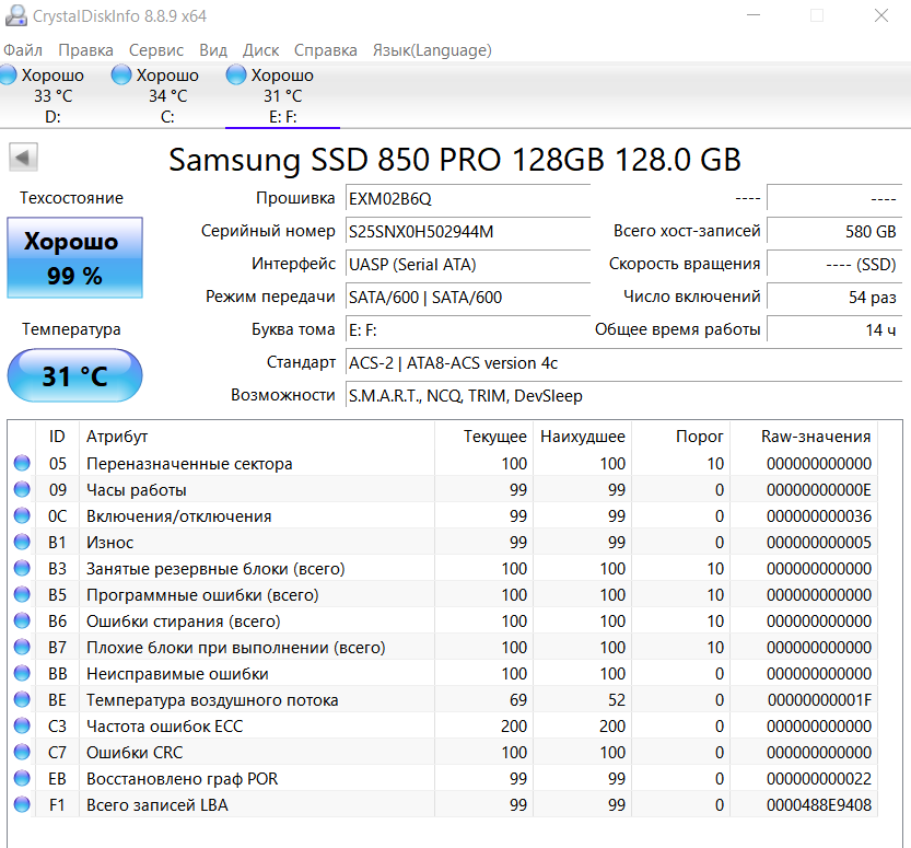 Утилита CrystalDiskInfo опять не видит контроллер кейса, а читает напрямую состояние диска SSD.