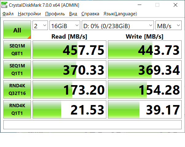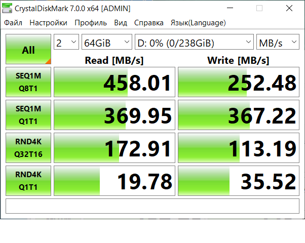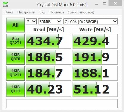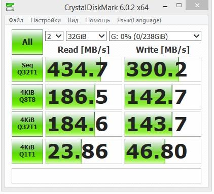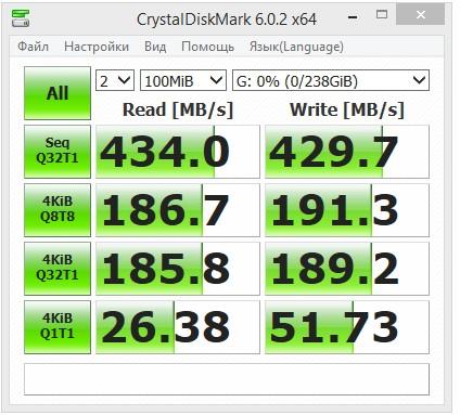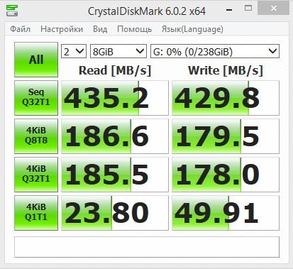 Далее тест (USB3.0) пакетом CrystalDiskMark показал хорошее распределение скоростей чтения и записи, нет провалов в зависимости от размера блока, скорость рандомного доступа также высокая.