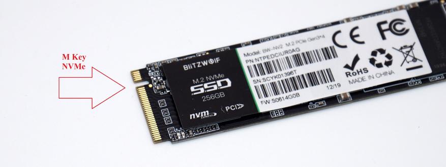 Обращаю внимание на ключ типа «М». Это значит, что диск не совместим с SATA контроллерами. Но работает с универсальными слотами SATA/NVMe, где присутствуют оба типа ключа «М» и «В».