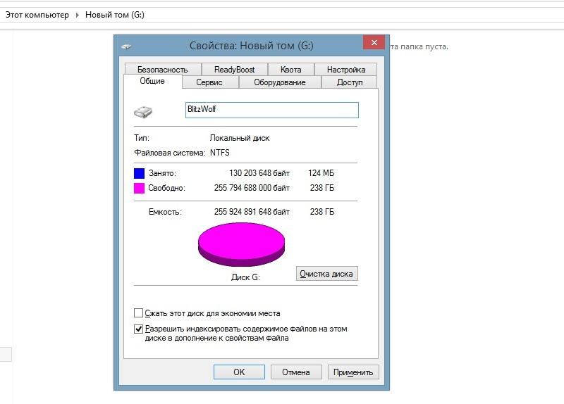 После инициализации и форматирования диск видится системой корректно, объем показывает 255 794 688 000 байт (~256 Гб).