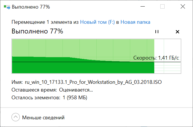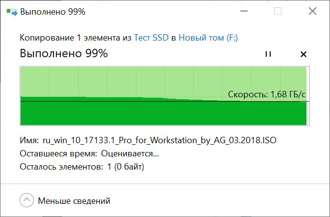 Запись тестового файла, объем которого стравляет 4.5 Гб, с накопителя KINGSTON SKC2500M8250G на Crucial SSD 250GB P5 M.2 NVMe