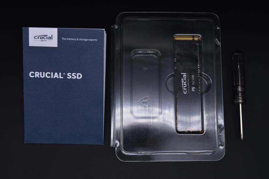 Внутри коробки, в пластиковом, прозрачном блистере расположен Crucial SSD 250GB P5 M.2 NVMe. Помимо него в комплект поставки входит краткая инструкция на нескольких языках, включая русский.